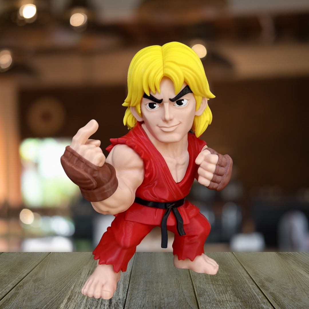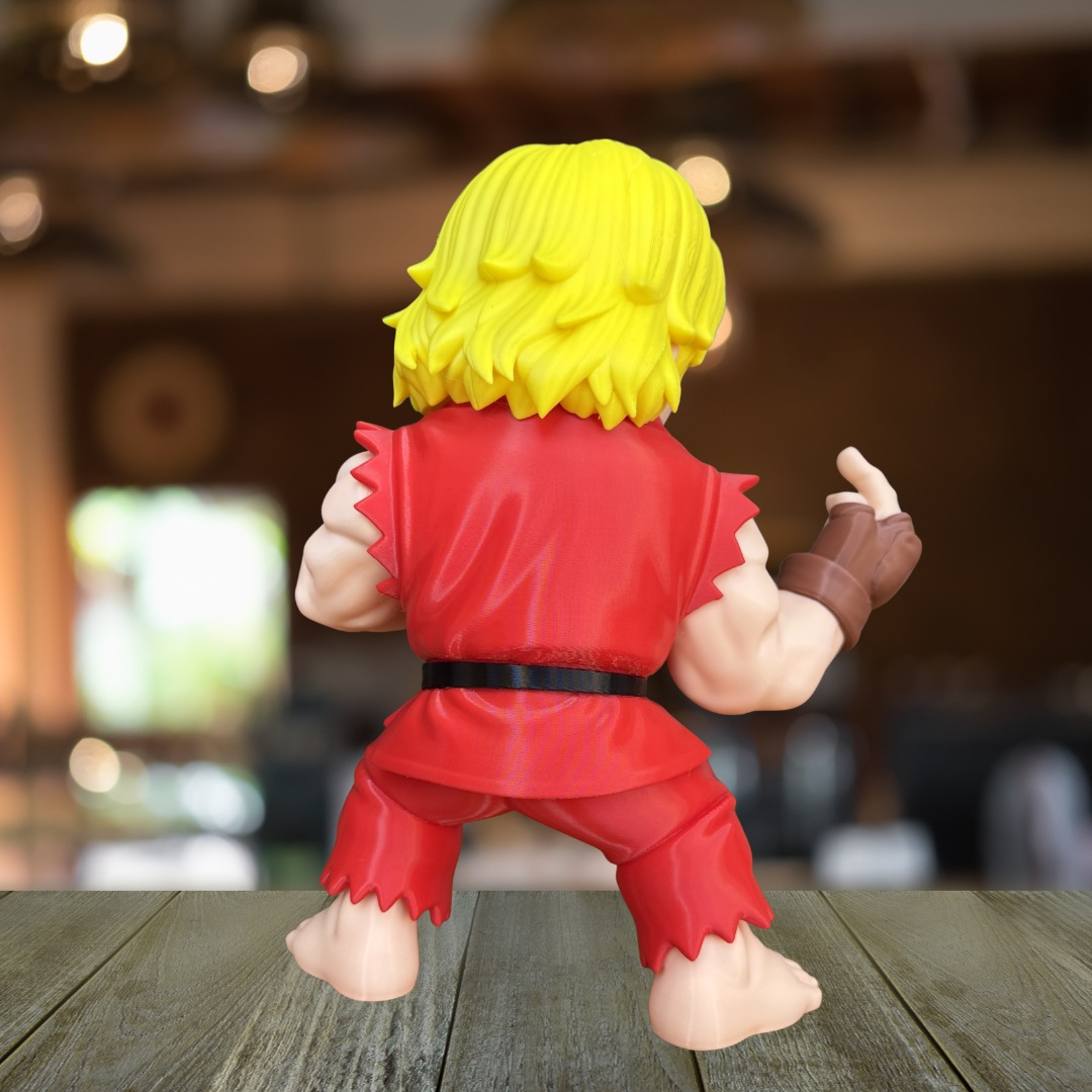 Uma versão chibi estilizada do impetuoso artista marcial, apresentando seu característico cabelo loiro comprido,